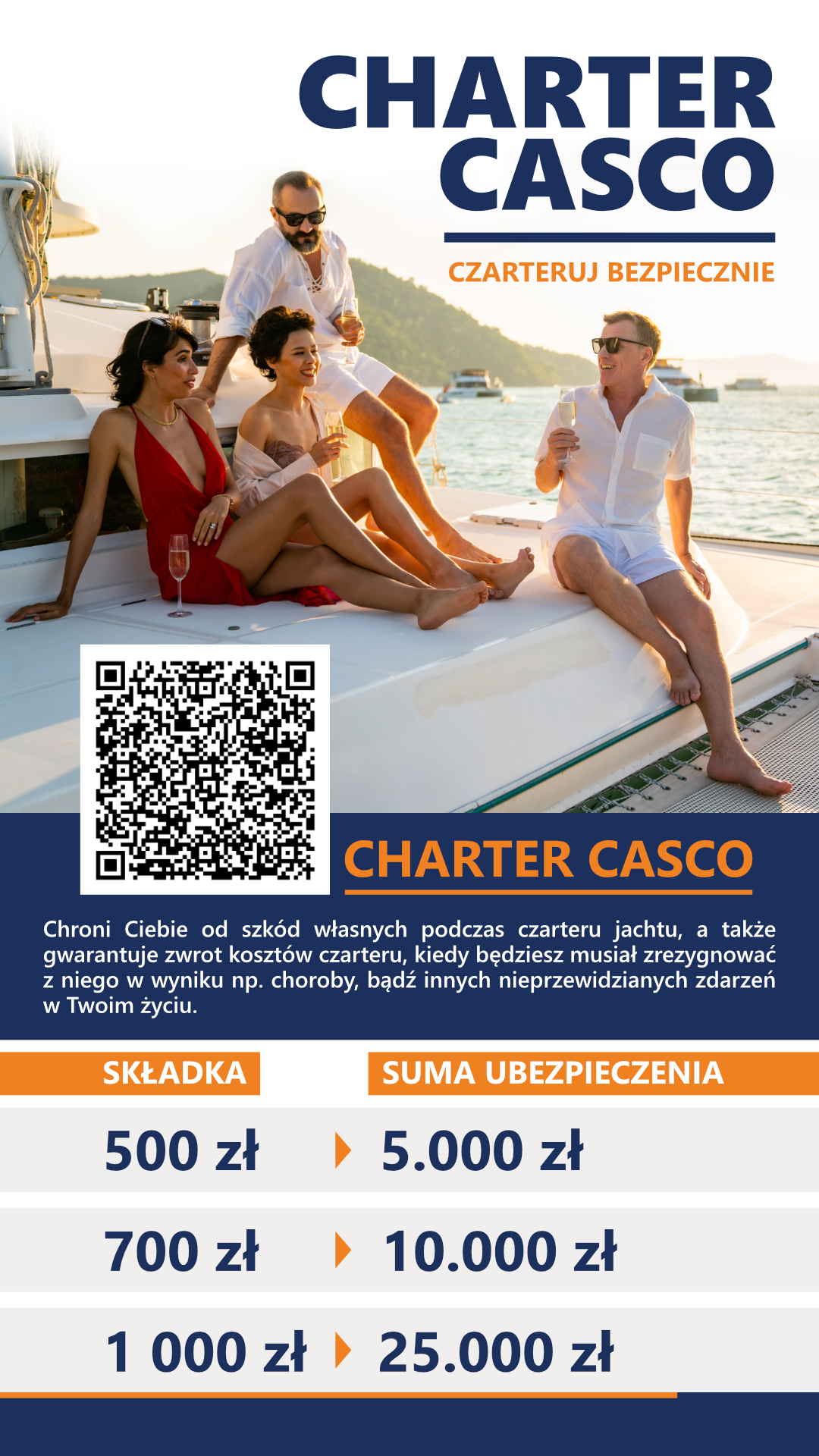 Najniższa suma ubezpieczenia Twojego CHARTER CASCO, jaką możemy wybrać w systemie to 5.000 PLN. W takim wypadku koszt zakupu takiej polisy wyniesie jedyne 500 PLN. Według nas to naprawdę dobra cena, jak za ochronę czarterowanego jachtu od szkód własnych z sumą ubezpieczenia 5.000 PLN. Jeśli suma ubezpieczenia 5.000 PLN jest dla Ciebie niewystarczająca, możesz wykupić wyższe warianty z ochroną do 10.000 PLN lub 25.000 PLN